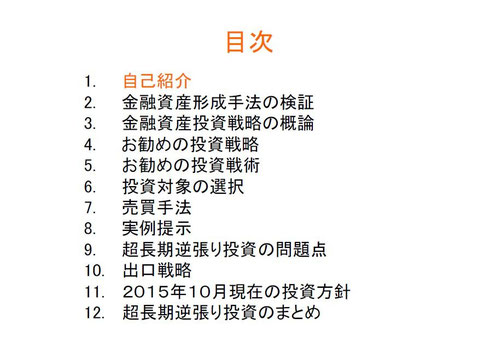 今回のセミナーでは、2001年から15年以上に渡る金融資産投資の経験をさまざまな角度から検証した上で、下記の2点にフォーカスして資料を作成しました。
